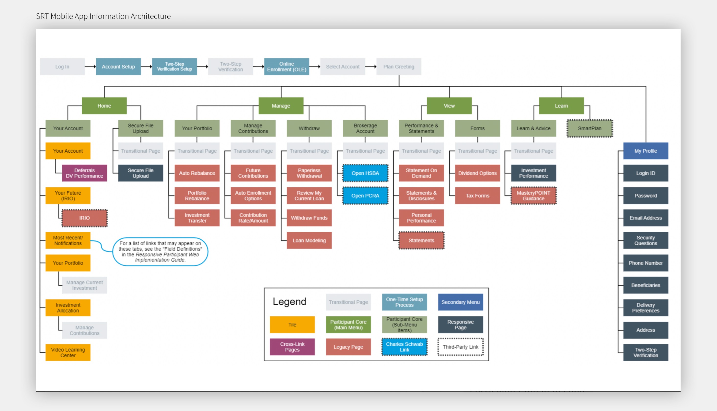 This IA supports key user journeys and business objectives. The goal is to support both novice and experienced users in managing their retirement and health savings accounts effectively.